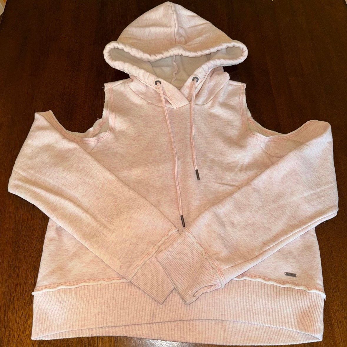 2. Hollister Cold Shoulder Cut Out Hooded Sweatshirt Heather Pink Size Medium. One small blue spot near hem as pictured.